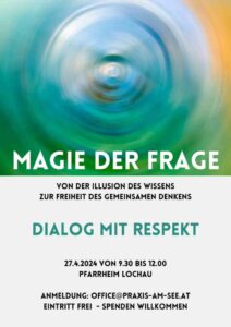 Unser nächster Dialog mit Respekt zum Thema “Magie der Frage” findet am Samstag, 27.4.2024 von 9.30 bis 12.00 im Pfarrheim in Lochau statt. Wir begeben uns dabei gemeinsam auf die Suche nach der möglicherweise wichtigsten Frage, die wir uns aktuell stellen sollten.